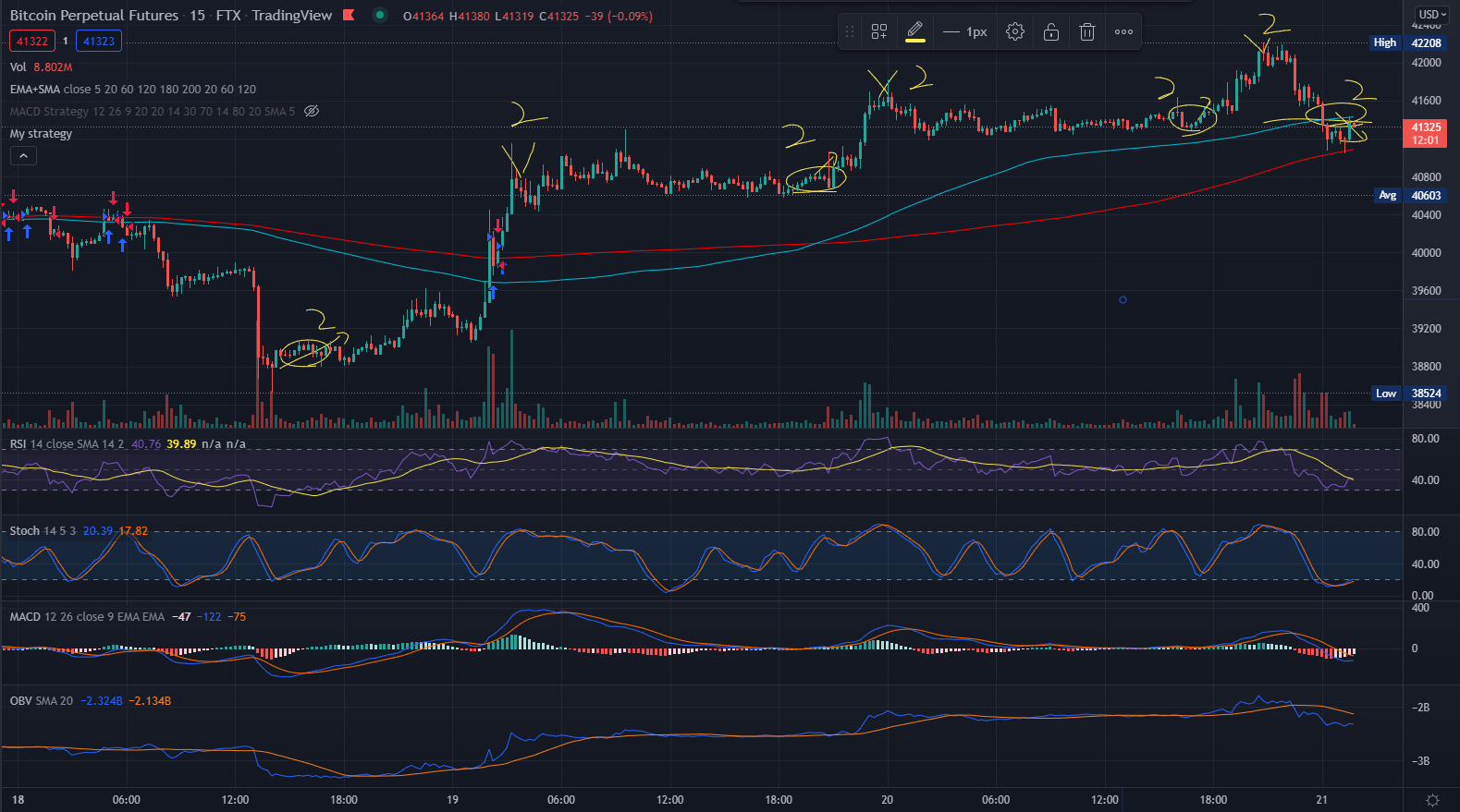 - Short 관점 : 과매수 구간에 있다가 모든 보조지표들이 우하향 하는 부분 확인 후 진입